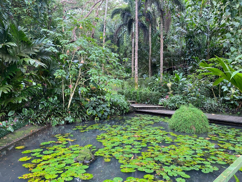 We wandered through the gardens, following the rambling paths every which way and attempting to do that Instagram influencer thing where two people hold hands, one in front of the other, and the person in the back videos the person in the front and…it turned out about as well as you might expect. Eventually, we found signs pointing us to the “the view” and as we began our ascent the first few drops of rain began. By the time we reached the top the few drops of rain turned into a downpour. It was a treacherous descent in our completely inappropriate-for-an-impromptu-hike-sandals and the rain-soaked mud and grass.