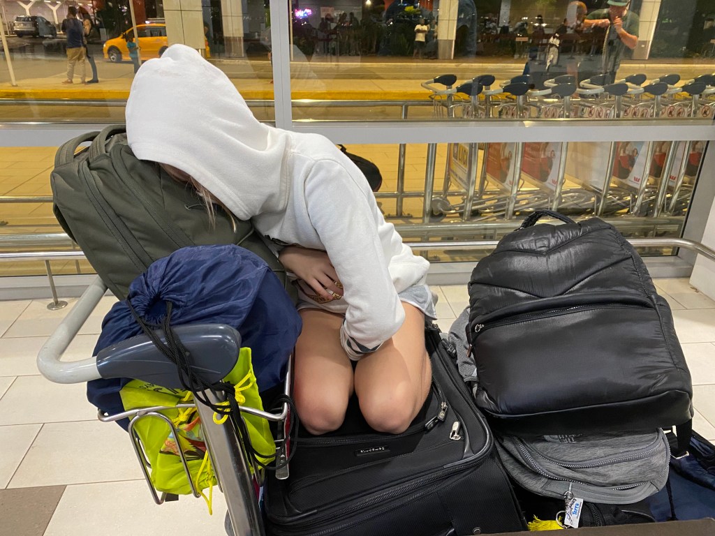 In my defense I had ever right to be crazy because this was a big day for me. It was the first time I was traveling via air with the girls by myself and this was a doozy of an itinerary. To get to Hawaii we had to fly from Singapore to Nadi, Fiji for 10 hours. We then had a 10-hour layover in Fiji (more on that later). The final leg of our journey was a 7-hour flight from Nadi to Hawaii. In total, we traveled for 27 hours, and the girls did amazingly up until the very last second as we were getting our luggage and then one daughter upset the other daughter (not hard to do) and not even daddy waiting to greet us with leis was enough to cheer anyone up.